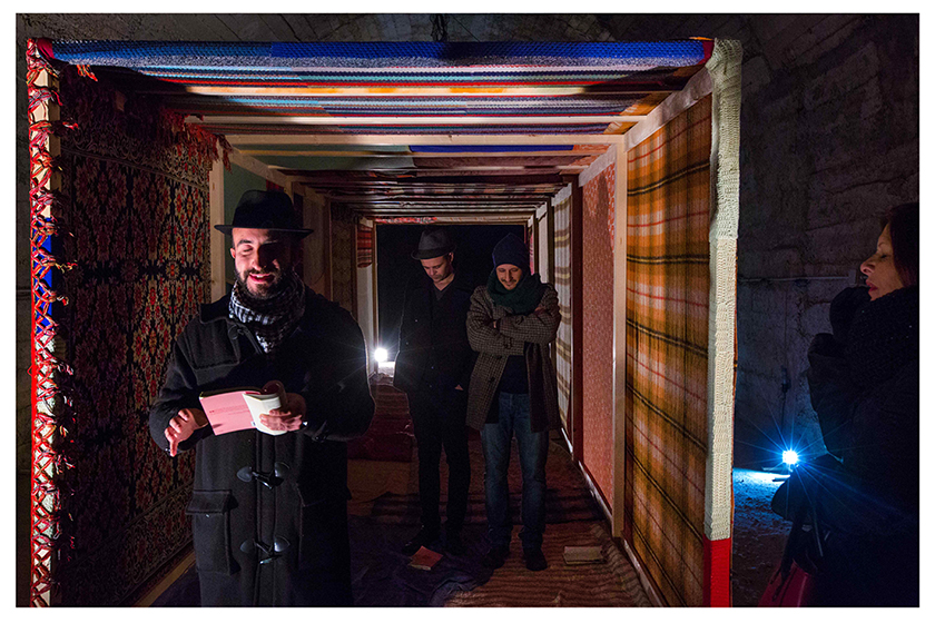(Heimweh, from “Heim” meaning home and the verb “wehtun,” meaning to hurt or ache. The English equivalent “homesickness” just doesn’t quite convey the same intensity). a project by M.Grazia Cantoni, Andrea Luporini and Daniela Spaletra, 2017 A scale reconstruction 1: 1 of a tunnel-shelter built with blankets inside a WWII air-raid shelter, in La Spezia, Italy. Subways offer a temporary shelter awaiting the uncertain future. The project Heimveh is a tribute to Syrians patchwork blankets to offer a symbolic refuge an act of solidarity. After the temporary installation (January 27-30) the blankets will be cleaned and sent to asylum seekers centres in Italy and Greece. Recreating the shelter within a defined space puts the viewer in the center of the experience of architecture. The perspective becomes central and only through the space you have a complete fruition. The gesture that unites trespassing an underpass and walking through the blankets tunnel of Heimweh is up, but the temporality is distinct. The project started in 2017 with a Crrowdfunding campaign to collect blankets and sleeping-sheets to be given to refugee camps and welcome facilities. The housing-tunnel becomes inner shell and outer structure rebuilt in the exhibition area to which the viewer comes up and does not stray, as it normally would through the tunnel. Trying in this way, to reconstruct the pace, to scan it and slow it down in order to trigger a slow, deep thoughts that bring us closer to the distress and trauma of those who live among us but live in isolation.