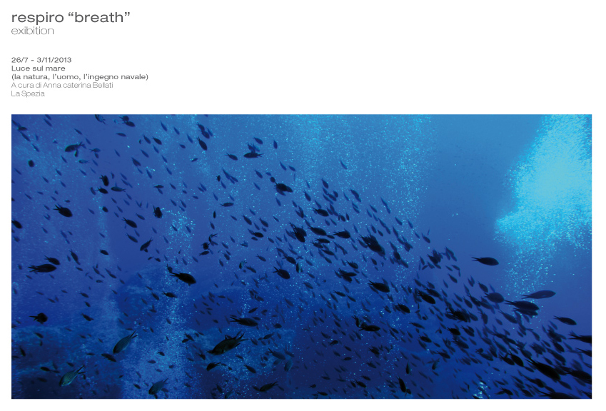 In Respiro viene proposta un’installazione complessa, in cui si sovrappongono una foto di ambiente marino proveniente dall’ENEA e una tela del 2010, Infinito, con un suggestivo accompagnamento sonoro. La foto, che ovviamente rimanda al tema della mostra e rappresenta una specie di cuore segreto e nascosto del lavoro, interessa all’artista per la luce che può catturarne, per creare un ambiente marino in cui i vari quadrati blu della tela palpitano e sviluppano sensazioni sinestetiche, innestate già dal titolo. Gli appassionati d’arte riconosceranno una variazione tecnologica del famoso lavoro di Pino Pascali Trentadue mq di mare. Cambia la prospettiva: non si gira intorno all’opera, ma vi ci si immerge, con una sollecitazione rivolta a tutti i sensi.